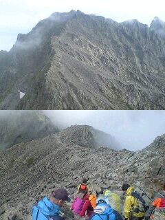 ハシゴの登りからスタートし、森林限界をとっくに越えた岩肌。ガスが一瞬晴れると西穂への尾根筋の門番ジャンダルムが圧倒的な存在感で姿を見せてくれ、思わず歓声!