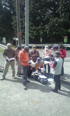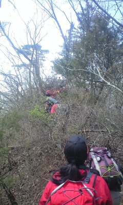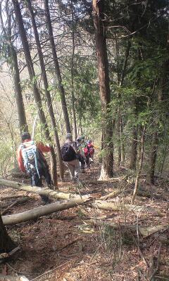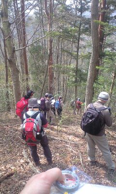 交代制リーダーは1人づつ。皆さん緊張の面持ち。明るく温かな春になりたての山を進みます。展望が開けなければ振り返って尾根筋を確認したり、沢筋を見たり。僅かなヒントを地形から導きます。
