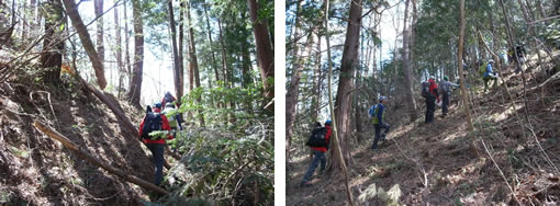 大月駅からバスに揺られる事10分。今回のスタート地点、上真木バス停に到着。まずは現在地を確認して整地。ほとんどの方が前回も参加されていて、さすがに2回目の実技ともなると、みなさん慣れたものです。